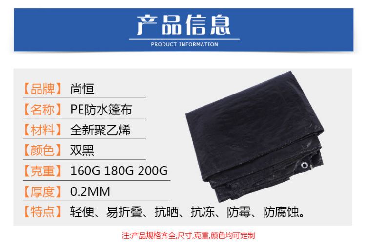 雙黑色PE防水篷布加大扣眼間距1.5m左右,牢固耐用不變形,4邊全部打孔,如需加密請告知。